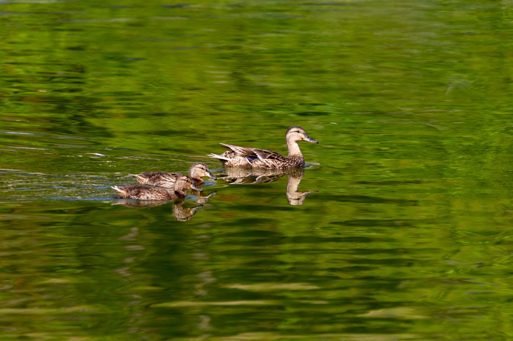 The reflections of the lush green trees surround the ducks in the water. The mother kept a close eye on me and led her babies away from me as I followed the family to photograph them. Watching them swim is so peaceful, even in the heat.