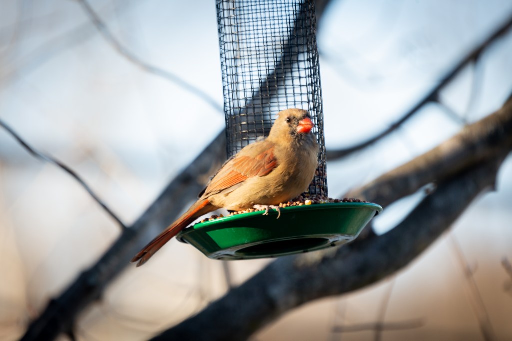 The clearing of the snow and rain show us that no matter how bad the storms get, sunny days are right around the corner. Sunny days mean more time for this female cardinal to lounge in the feeder. She has been doing this since late August. She will rest in the feeder for up to an hour at a time. The trend was started by a sparrow on a very hot day. The other birds don’t seem to mind one bit. They will just fly around her.