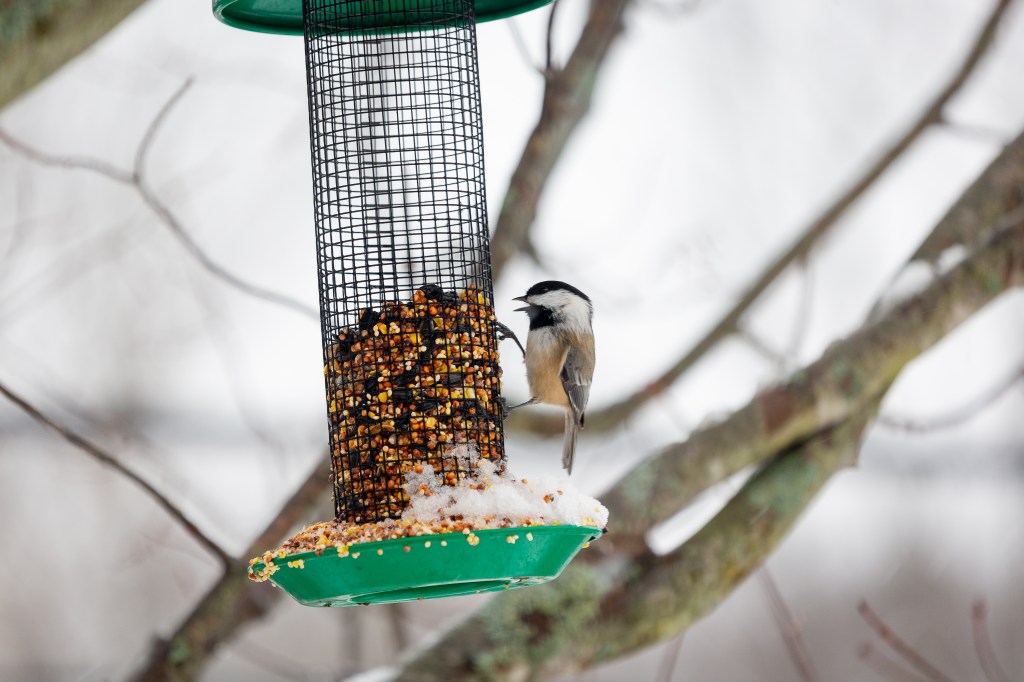 The first snow did not last very long. It accumulated overnight and was still snowing a few hours into the morning. Bigger storms would cause the birds to hide out until storm ended before trying to get to the feeder. However the light fluffy snow didn’t bother this chickadee one bit. The chickadee fluttered around happily selecting the perfect seeds.
