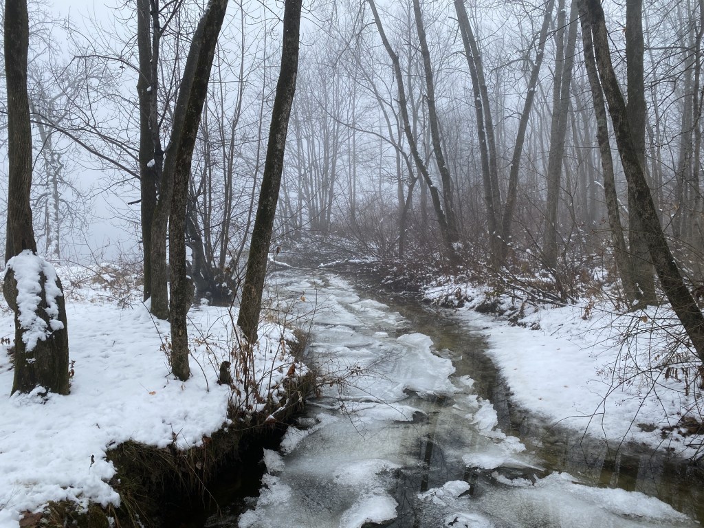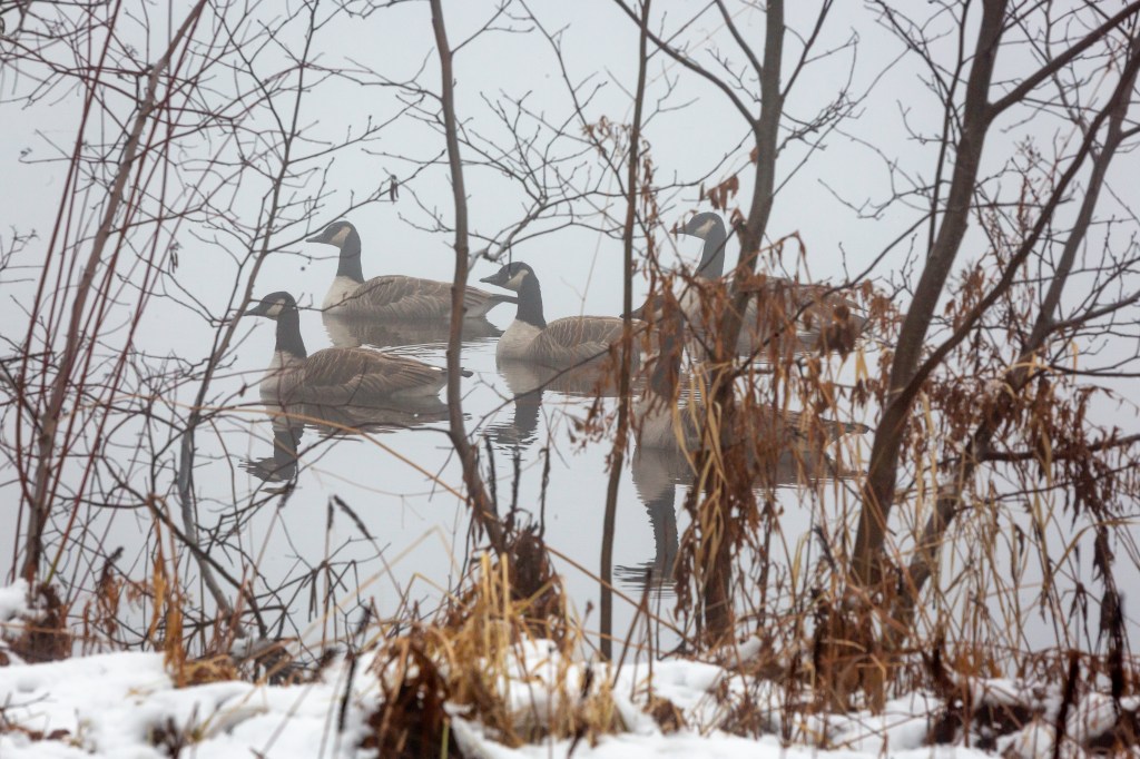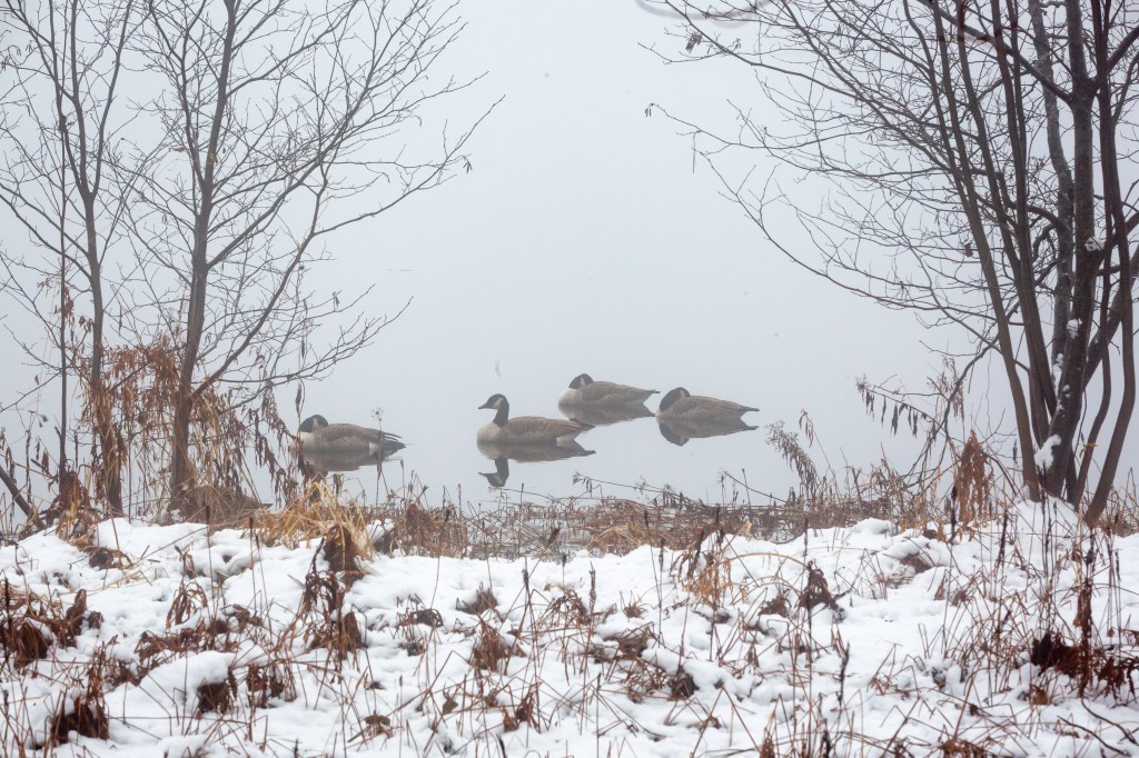 The spell broken, I went on to the end of the path to see if I might stumble across my ducks. The small stream was frozen over, and no ducks were visible. I heard the gentle honking in the river and looked through the branches to see the geese floating along the edge further back in the fog. They continued to move further and further away.